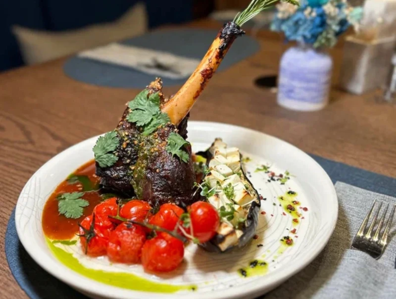 Голяшка, тушёная в красном вине с овощами, с баклажаном гриль, сыром брынза и печёными томатами черри